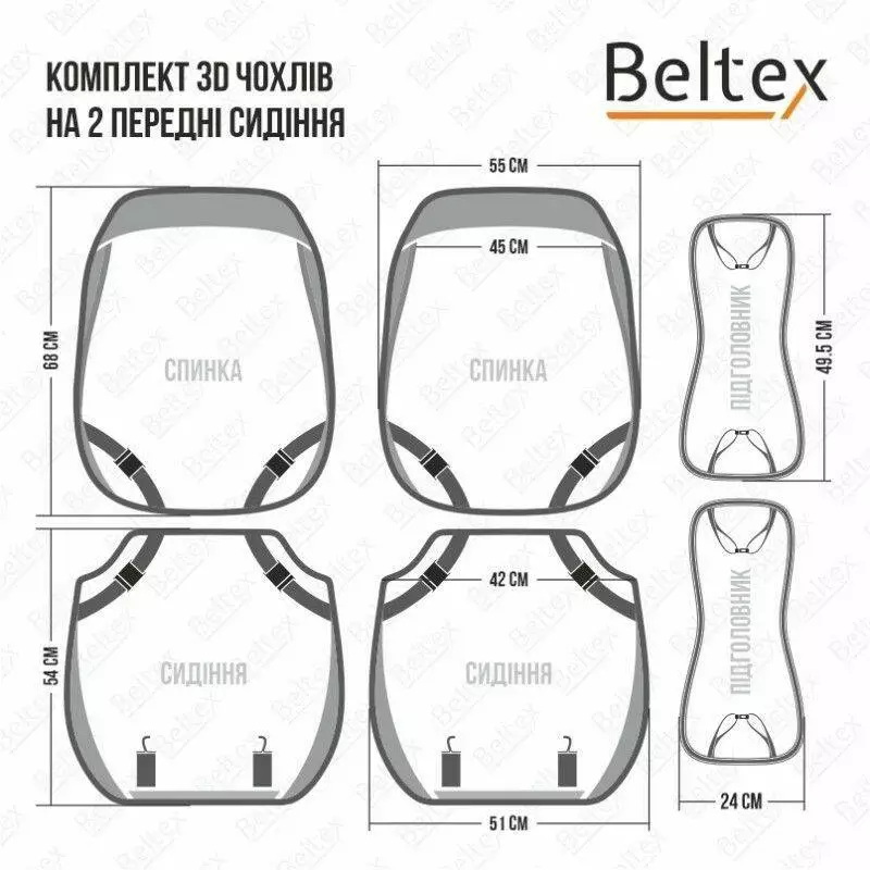- Комплектація набору: Передні сидіння - 4 елементи, Задні сидіння - 6 елементів, Підголівники – 5 елементів