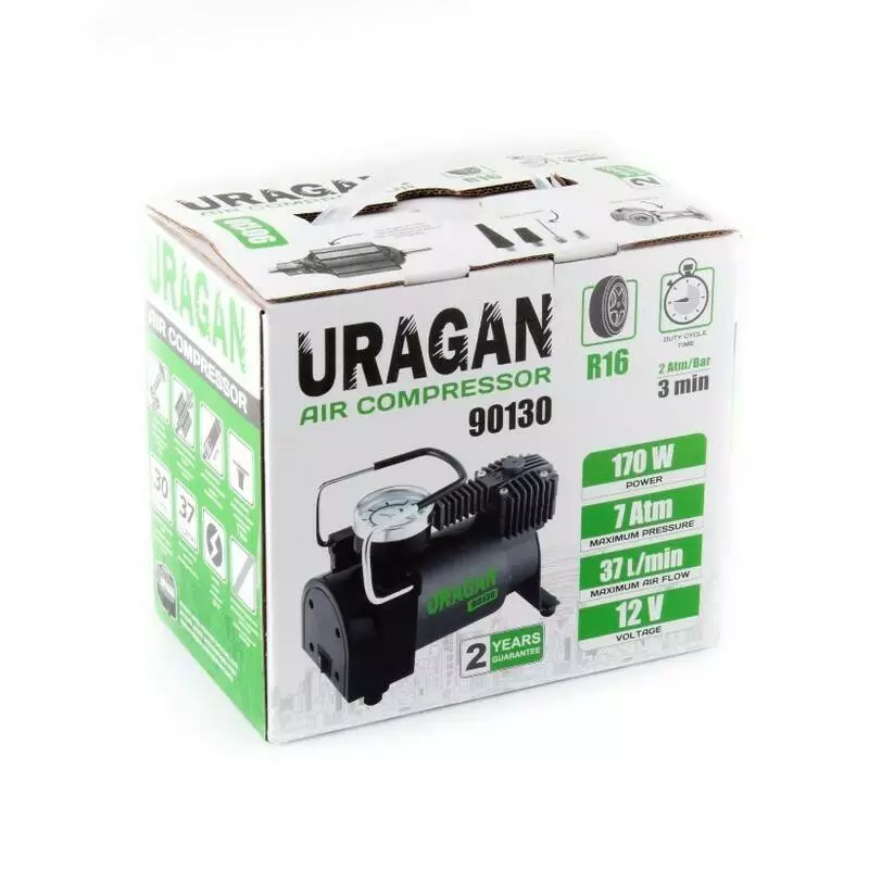Автокомпрессор однопоршневой от прикуривателя URAGAN автомобильный компрессор для шин R13-R16 7Атм 37 л/мин 170Вт (90130)