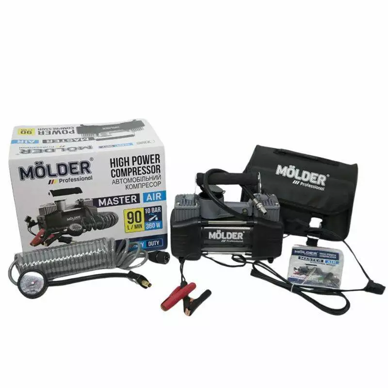 Автомобильный компрессор двухпоршневой MOLDER с витым шлангом для накачки шин R13-R21 10Атм 90 л/мин 360 Вт (MA25200)