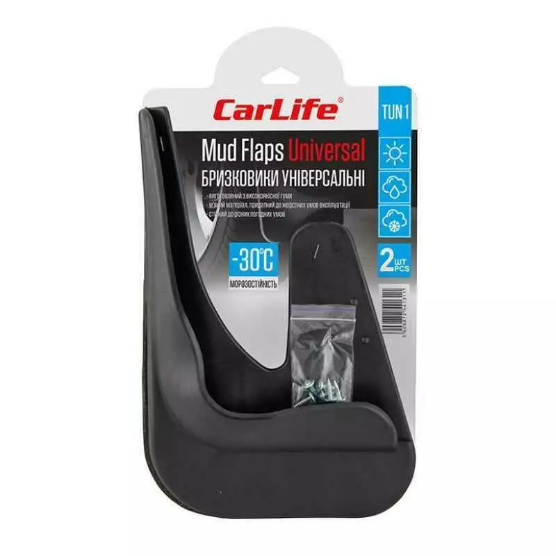 Брызговики CarLife MF1 MUD FLAPS TUN1 – это универсальный комплект, эффективно защищающий от дорожных элементов нижнюю переднюю часть автомобиля. Особый термопластичный полимер в качестве основного материала и универсальная конструкция выгодно выделяют аксессуар среди аналогов.