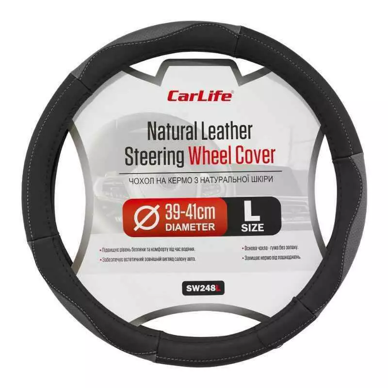 Чехол на руль Carlife 39 - 41см, кожа, черный с серыми вставками (SW248L)