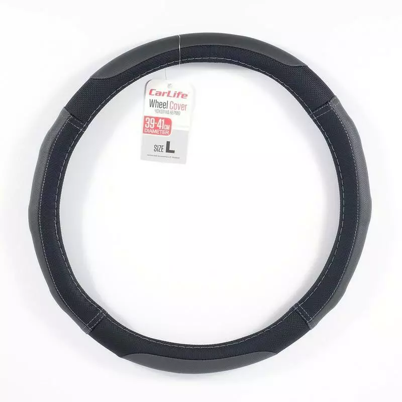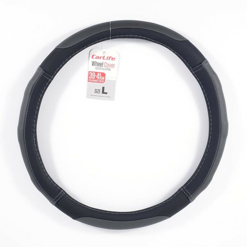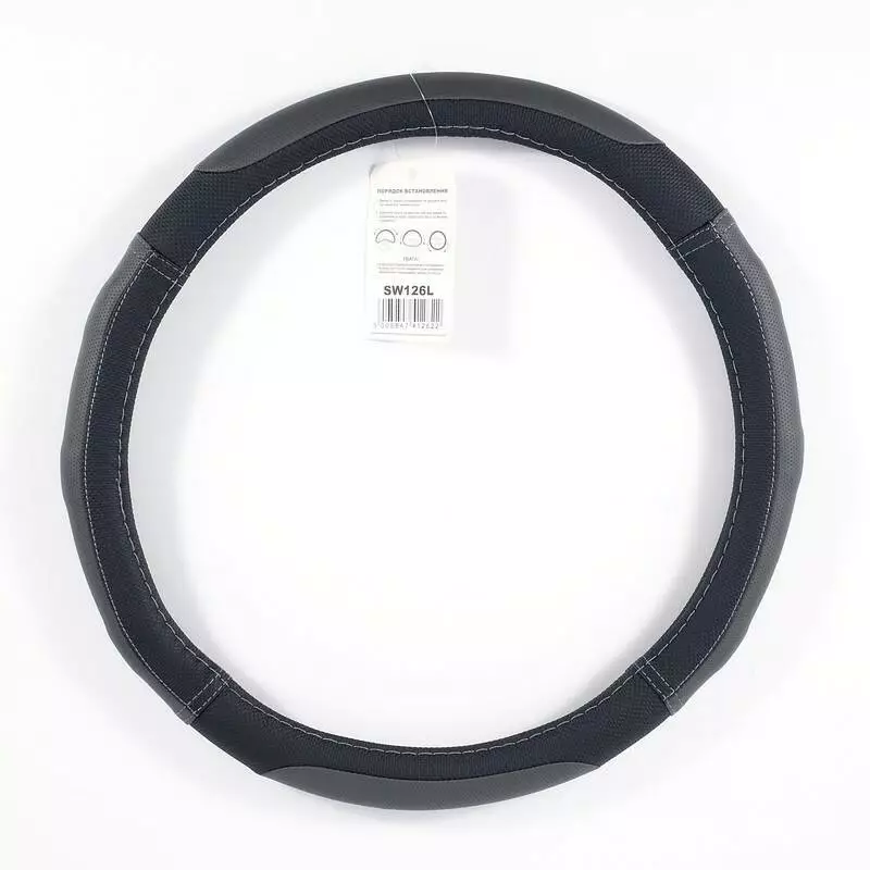 Чехол на руль L (39-41 см) из экокожи и белой резины CARLIFE черный с серыми вставками и перфорацией (SW126L)