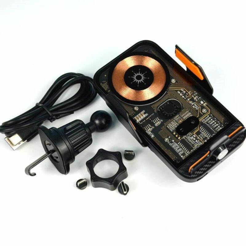 Держатель совместим с различными моделями телефонов благодаря универсальной конструкции. Пользователь может быстро закрепить гаджет и снять его одним движением. Прочный зажим надежно держит устройство даже во время движения по неровностям. Функция беспроводной зарядки позволяет не подключать кабель каждый раз, когда нужно зарядить телефон.