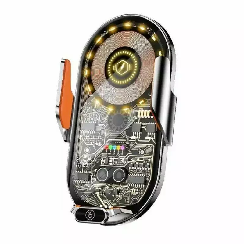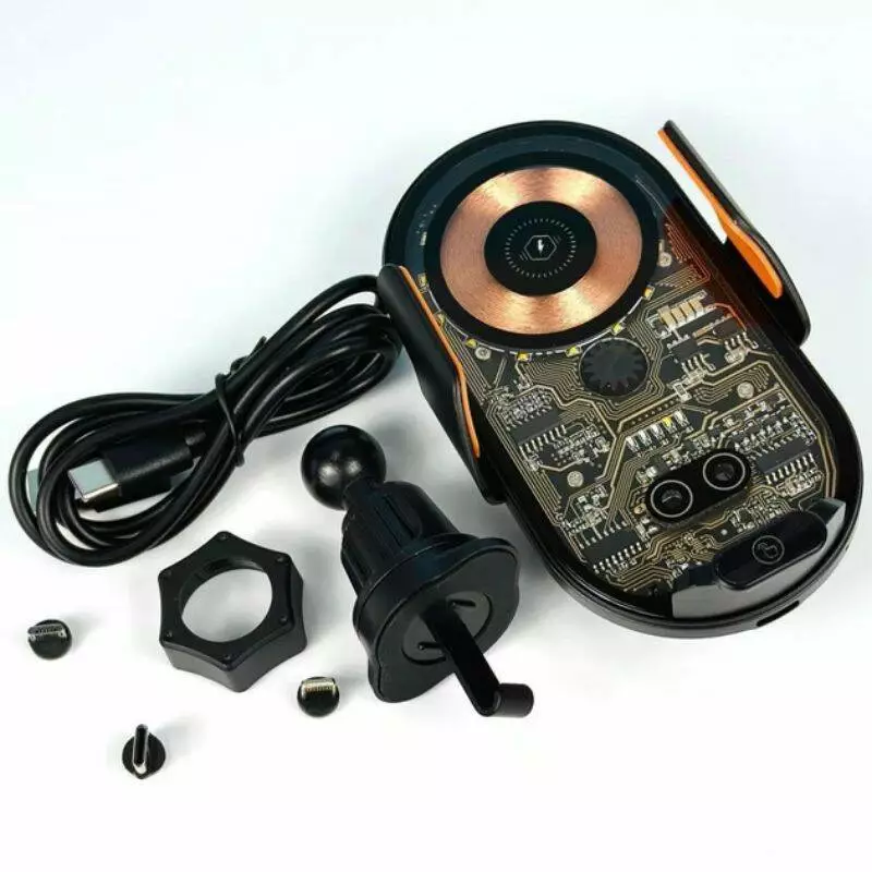 Держатель надежно крепится на вентиляционную решетку с помощью зажима. Совместим с большинством моделей смартфонов, в том числе Apple iPhone. Встроенная технология беспроводной зарядки позволяет заряжать телефон в пути, не используя кабель. Корпус держателя выполнен из прочных материалов, устойчивых к царапинам. Резиновые вставки защищают телефон от повреждений во время фиксации. Компактная конструкция не закрывает поток воздуха и не отвлекает водителя во время движения.