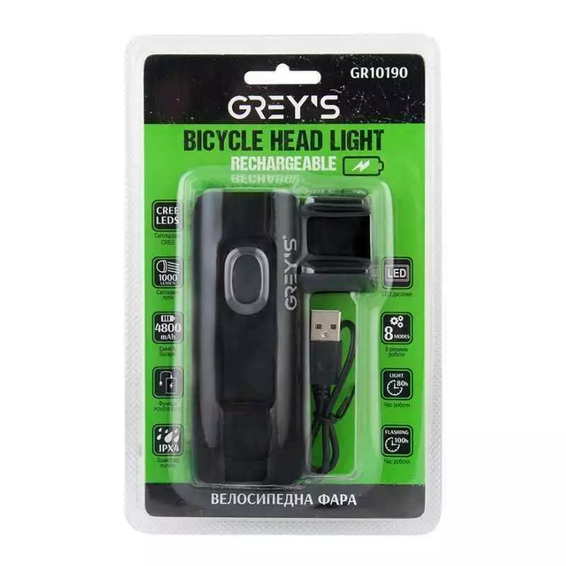 Фара на велосипед на руль 1000Lm Grey's 4800mAh IPX4 8 режимов до 80 часов работы (GR10190)