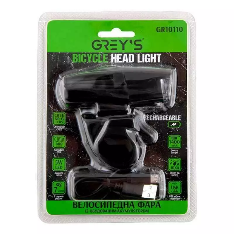Фара на велосипед на руль 400Lm Grey's 1400mAh IPX4 8 режимов до 9 часов работы (GR10110)