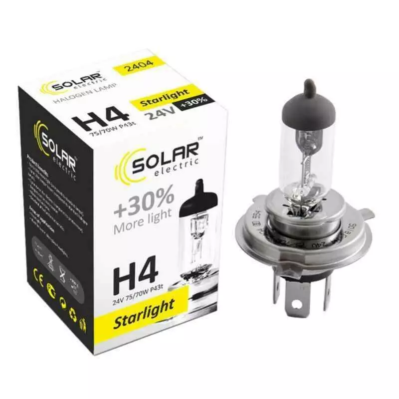 Галогеновая лампа SOLAR H4 +30% 24V 2404 – данное световое решение для водителей, которые ищут баланс между ценой и качеством и при этом не хотят переплачивать за бренд. Галогеновая лампа SOLAR H4 +30% 24V 2404 обладает прекрасными характеристиками и является прекрасным решением для замены вашей штатной галогеновой лампочки. Прекрасно устанавливается в штатные места и эффективно работает на протяжении заявленного срока службы.