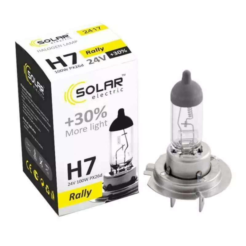 Галогеновая лампа SOLAR H7 +30% 24V 2417 – данное световое решение для водителей, которые ищут баланс между ценой и качеством и при этом не хотят переплачивать за бренд. Галогеновая лампа SOLAR H7 +30% 24V 2417 обладает прекрасными характеристиками и является прекрасным решением для замены вашей штатной галогеновой лампочки. Прекрасно устанавливается в штатные места и эффективно работает на протяжении заявленного срока службы.