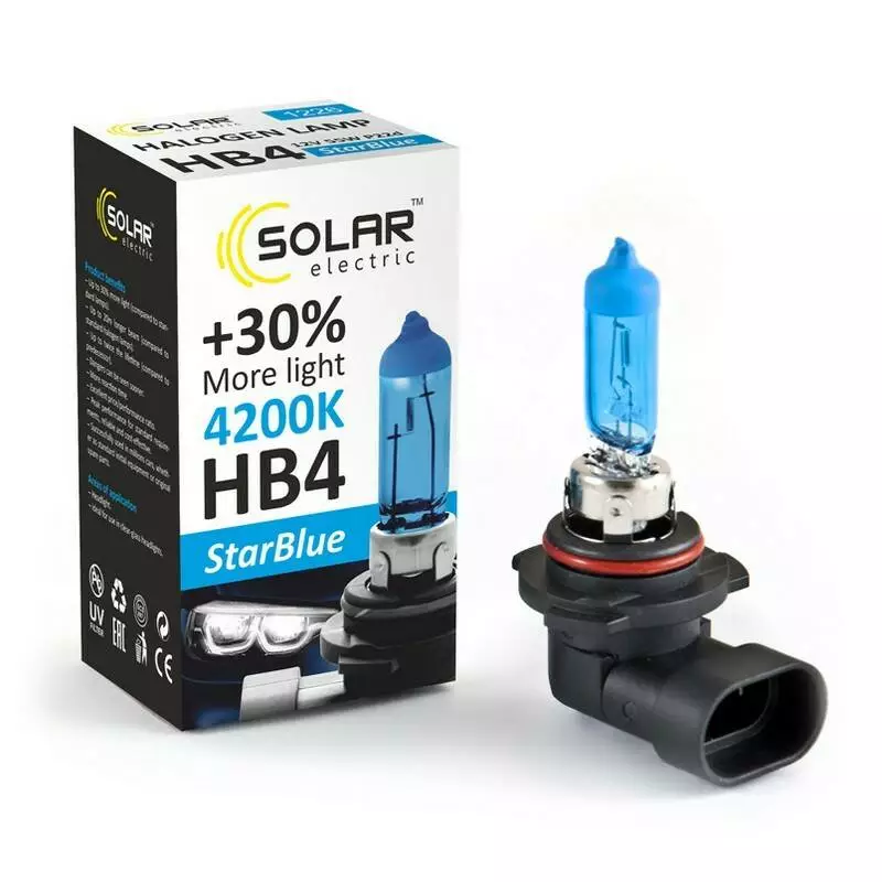 В производстве данных ламп применяются инновационные технологии с использованием высококачественным материалов и производством лучших продуктов. Галогеновая противотуманная лампа Solar HB4 12V 55W P22d StarBlue 4200K (1226) соответствуют высочайшим стандартам качества OEM, что позволяет вам максимально уверенно и эффективно передвигаться в темное время суток.