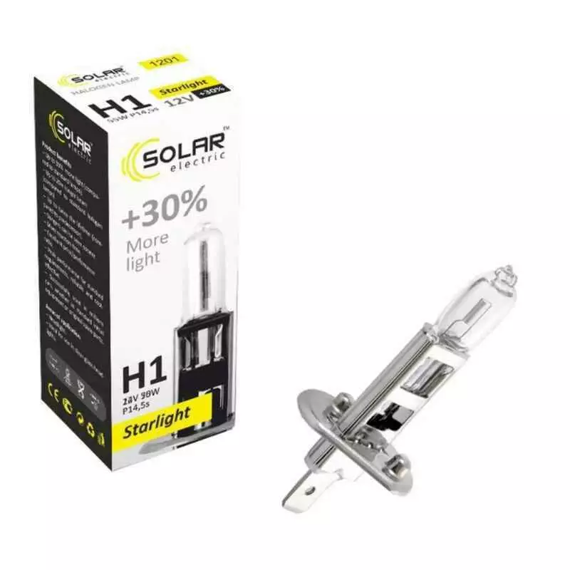 Галогеновая лампа SOLAR H1 +30% 12V 1201 – данное световое решение для водителей, которые ищут баланс между ценой и качеством и при этом не хотят переплачивать за бренд. Галогеновая лампа SOLAR H1 +30% 12V 1201 обладает прекрасными характеристиками и является прекрасным решением для замены вашей штатной галогеновой лампочки. Прекрасно устанавливается в штатные места и эффективно работает на протяжении заявленного срока службы.