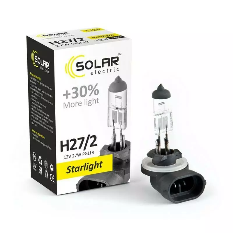 В производстве данных ламп применяются инновационные технологии с использованием высококачественным материалов и производством лучших продуктов. Галогеновая противотуманная лампа Solar H27/2 12V 27W PGJ13 Starlight +30% (1228) соответствуют высочайшим стандартам качества OEM, что позволяет вам максимально уверенно и эффективно передвигаться в темное время суток.