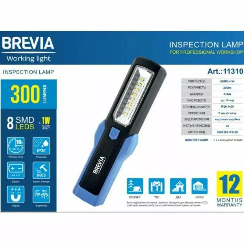 Лампа инсп. Brevia LED 8SMD+1W LED 300lm, 3xAA