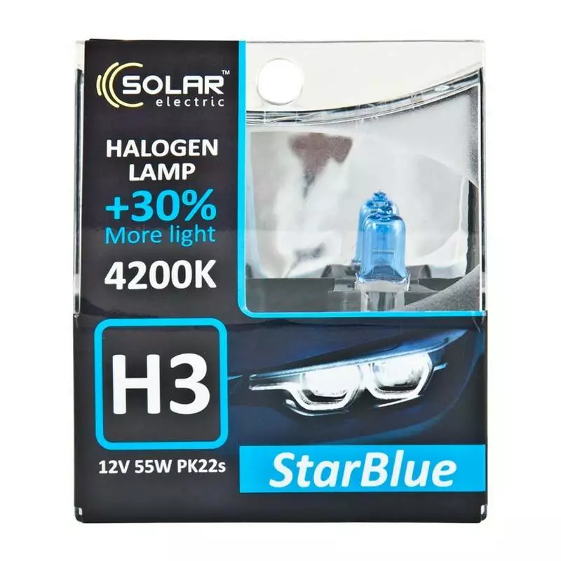 В производстве данных ламп применяются инновационные технологии с использованием высококачественным материалов и производством лучших продуктов. Галогеновая противотуманная лампа Solar H3 12V 55W PK22s StarBlue 4200K (1243S2) соответствуют высочайшим стандартам качества OEM, что позволяет вам максимально уверенно и эффективно передвигаться в темное время суток.