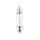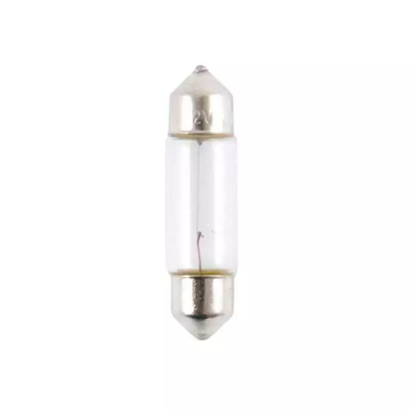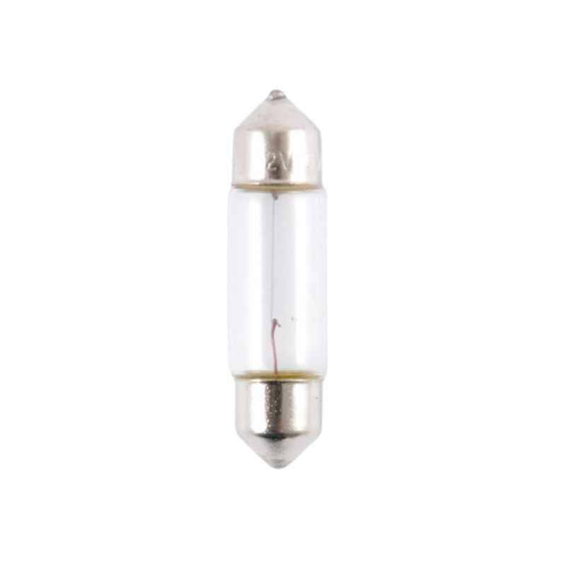 Лампочка накаливания с не окрашенной колбой, излучает яркий белый свет. Потребляемая мощность в 10 Вт, дает достаточно хорошое свечение. Тип лампочки C10W/SV8.5-8 или Festoon, это двухцокольные. Нить накаливания представленная в виде одной спирали. Угол рассеивания света 360 градусов. Предназначены для замены заводского света в автомобили с напряжением бортовой сети 12 В, это легковые автомобили и мотоциклы.