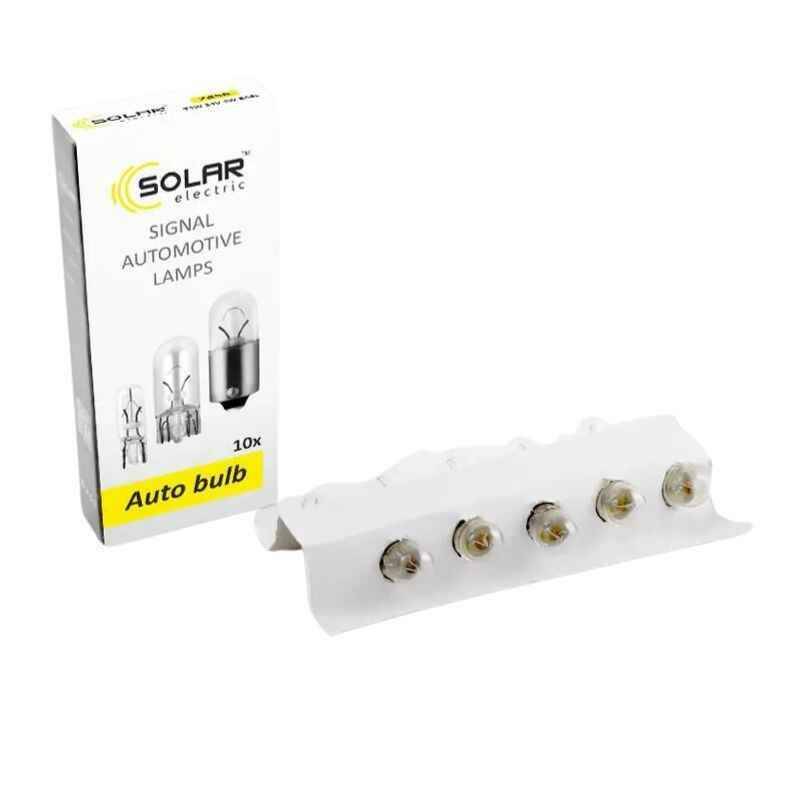 Это лампочка накаливания от компании SOLAR, послужат отличной заменой оригинальным ламп. Отличается увеличенным сроком службы и надежностью. Сохраняет стабильную световую мощность на всем протяжении срока эксплуатации. Применяется во внешнем освещении для габаритных и поворотных огней передней оптике, и во внутреннем освещении для приборной панели, салона и багажника. При ярком излучении они помогают своевременно сообщить о своих намерениях другим участникам дорожного движения, во избежании аварийных ситуаций, при любых погодных условиях. Конструкция устойчивая к вибрациям и выдерживает экстремальные нагрузки, тем самым увеличивается срок службы. Размер стандартный, соответствует посадочному месту в фаре. Установка таких лампочек очень проста, Вы это можете сделать самостоятельно, в домашних условиях, главное не притрагиваться к колбе лампочки.
