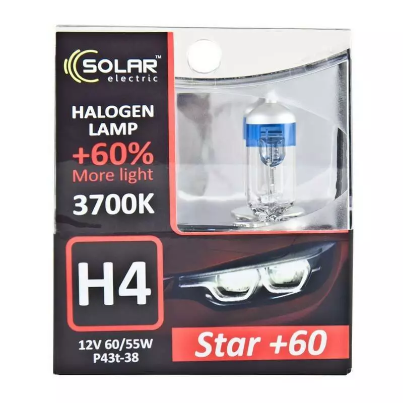 В производстве данных ламп применяются инновационные технологии с использованием высококачественным материалов и производством лучших продуктов. Галогеновая противотуманная лампа Solar H4 12V 60/55W P43t-38 Starlight +60% (1234S2) соответствуют высочайшим стандартам качества OEM, что позволяет вам максимально уверенно и эффективно передвигаться в темное время суток.