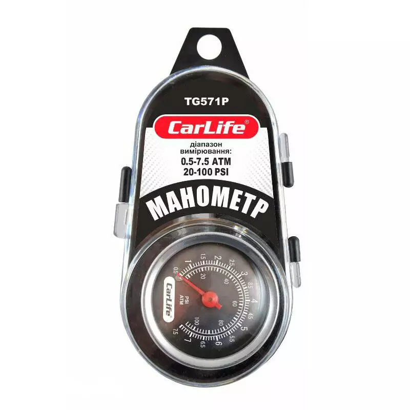 Манометр аналоговый CarLife для легкового авто 7.5 Атм с кнопкой сброса в пластиковом футляре (TG571/P)