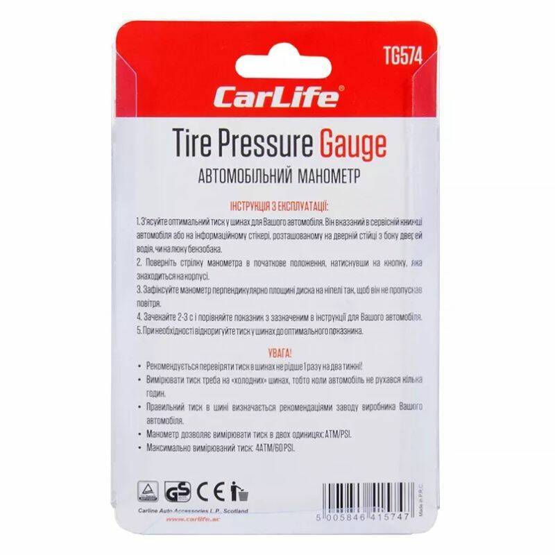 Манометр автомобильный CarLife TG574 4 атм