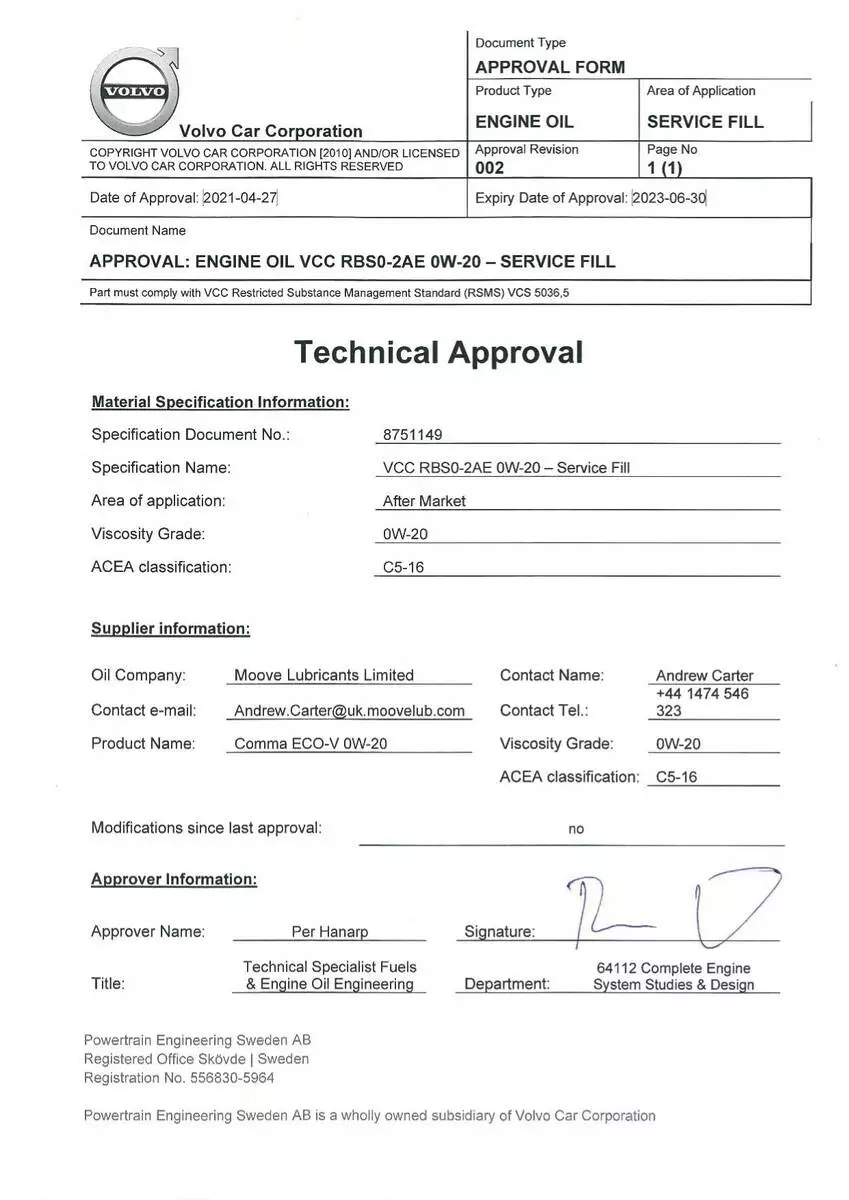 - Допуски ОЕМ: Volvo VCC RBS0-2AE