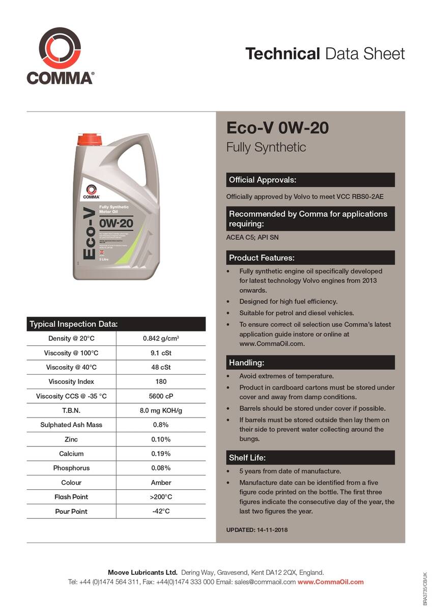 Моторное масло Comma ECO-V 0W20 API SN; ACEA C5 5л (4шт/уп)