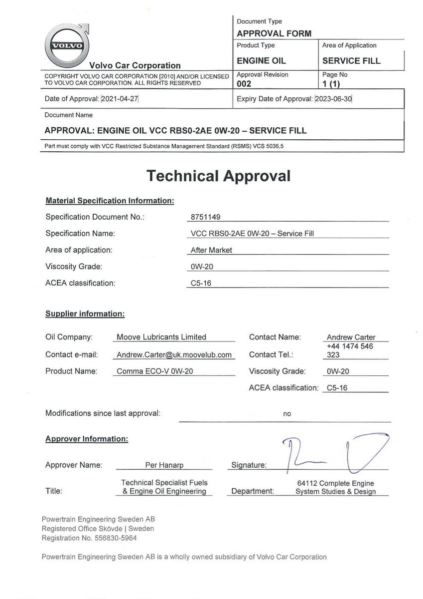 - Допуски ОЕМ: Volvo VCC RBS0-2AE