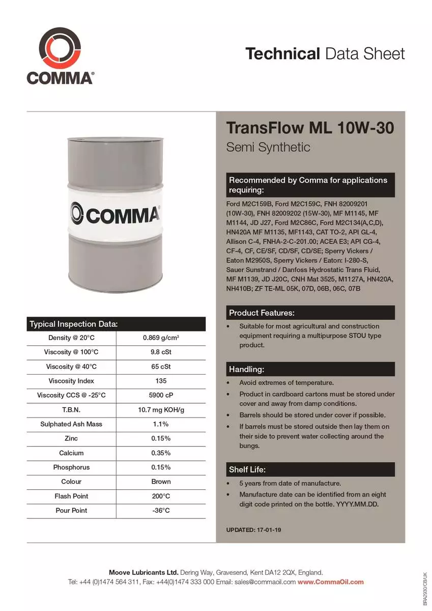 Моторное масло Comma TRANSFLOW ML 10W-30 API GL4/CE/CF-4/CG-4/SF/CD; ACEA E3 5л (4шт/уп)