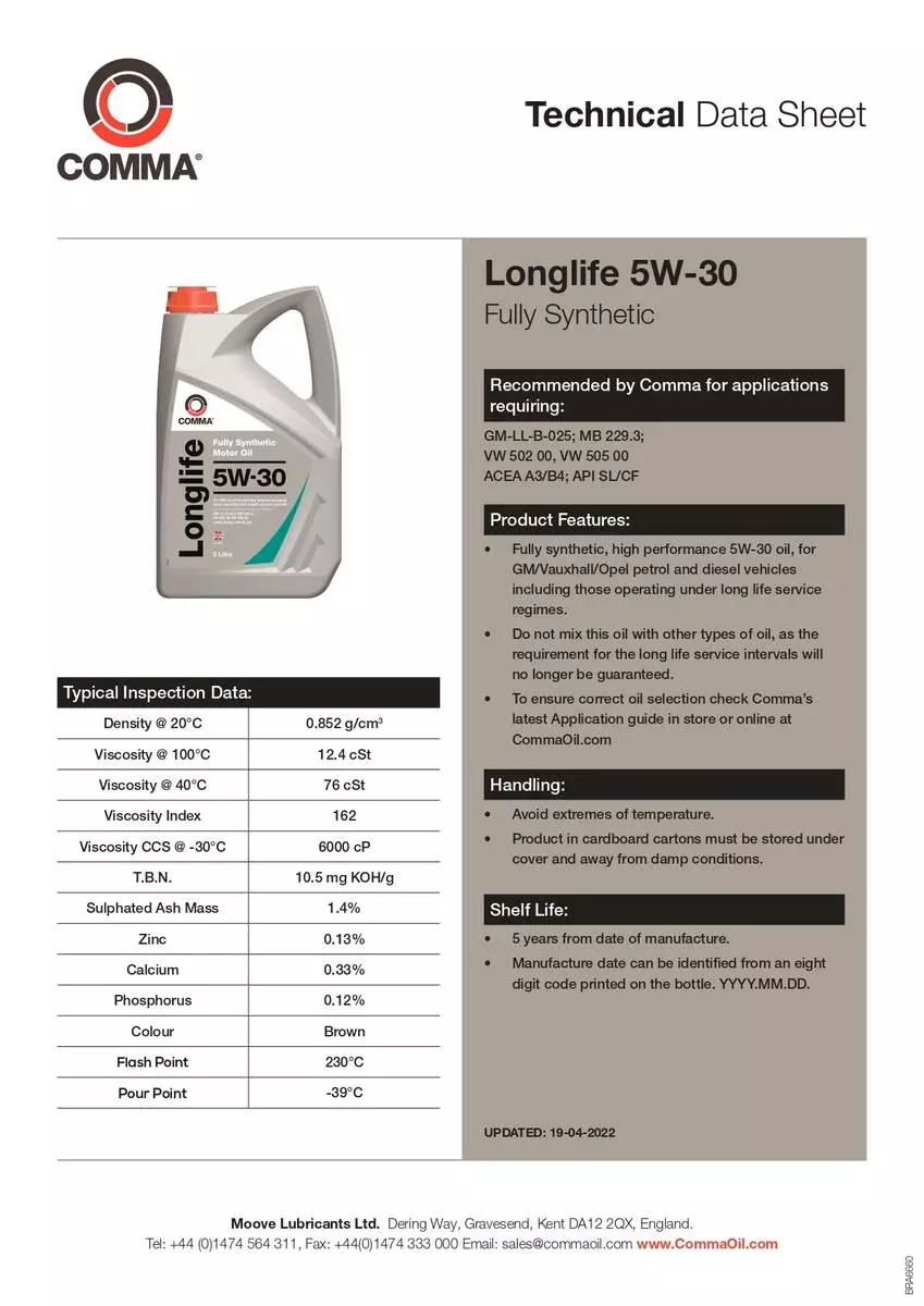 Моторное масло Сomma LONG LIFE 5W-30 API SL, CF; ACEA A3/B4 1л