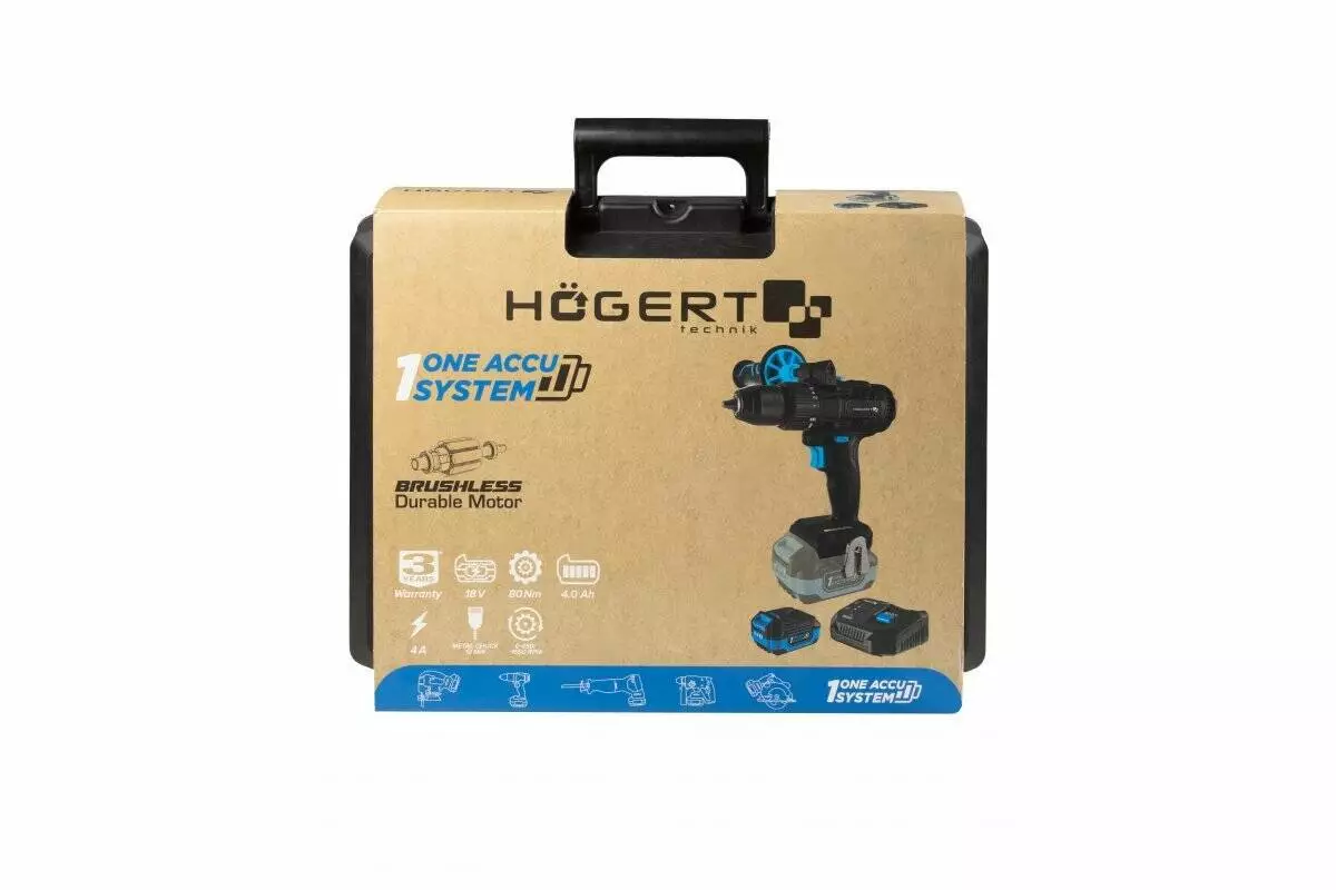 Аккумуляторная дрель-шуруповерт Hogert 18В 80Нм 4Ач зарядная станция 4А кейс HT2E246-B14DD