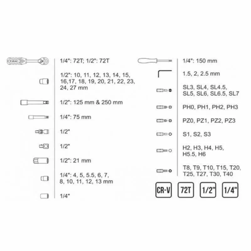 - До набору входить: Торцеві головки, Перехідники, Подовжувачі, Воротки, Кардани, Свічкові головки, Біти, Ключі