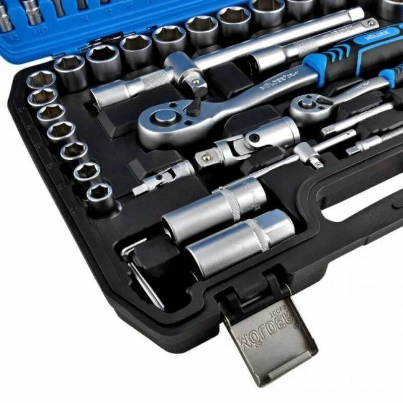 Комплект включает в себя насадки, удлинители, адаптеры, карданные шарниры, свечные головки и биты различных профилей и размеров, что делает набор незаменимым для сервисных центров, автолюбителей и домашних мастеров.