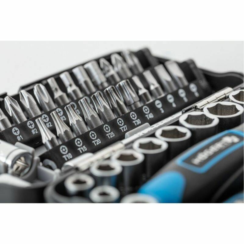 В наборе представлены головки от 5.5 до 14 мм, а также самые востребованные биты (шлицевые, крестовые, PZ, TORX, HEX) для выполнения широкого спектра задач — от ремонта электроники до обслуживания автомобилей.