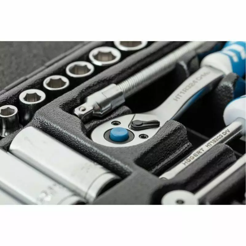 Набор инструментов Hogert HT1R486 на 63 предмета — это расширенное решение для специалистов, работающих с автомобилями, оборудованием и различной техникой. В комплекте представлены самые востребованные шестигранные и Torx головки, биты, карданные соединения, удлинители, адаптеры и воротки. Все инструменты выполнены из прочной легированной стали CrV и CrMo, что обеспечивает их надежность и долгий срок службы при интенсивной эксплуатации. Особенностью набора является компактный металлический футляр, который не только защищает комплект от повреждений, но и гарантирует его долговременное хранение в любых условиях.