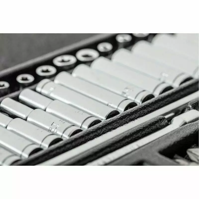 Шестигранные и Torx головки обеспечивают полный охват наиболее популярных типов крепежа в автомобилях и оборудовании, а большое количество удлинителей и карданных соединений позволяет работать даже в труднодоступных местах.