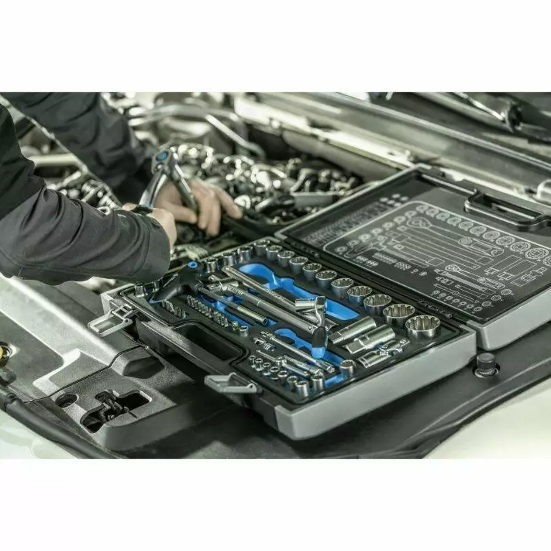 В наборе присутствуют трещотки, воротки, отвертки и гибкие удлинители, что позволяет легко производить ремонтные работы даже в труднодоступных местах автомобиля или оборудования.