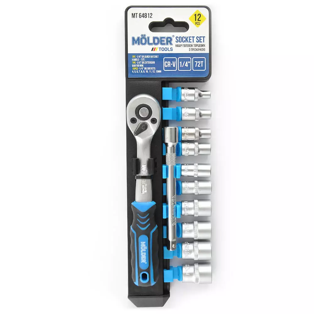 Набор торцевых головок с трещ. и удлин. Molder 1/4" 72Т, CR-V, 4-13 мм, 12шт
