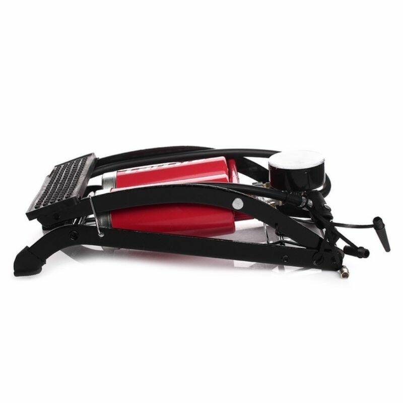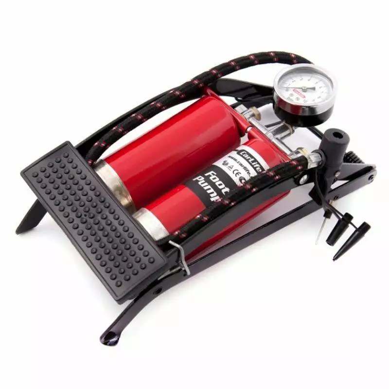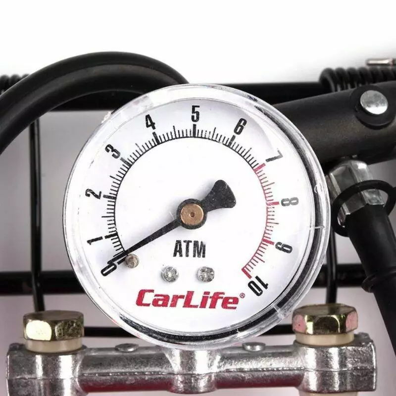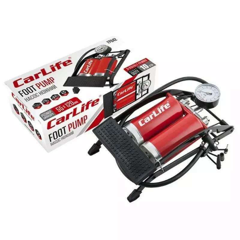 Насос ножной CARLIFE 55ммx120мм, два цилиндра с манометром и дополнительными адаптерами, 10 Атм