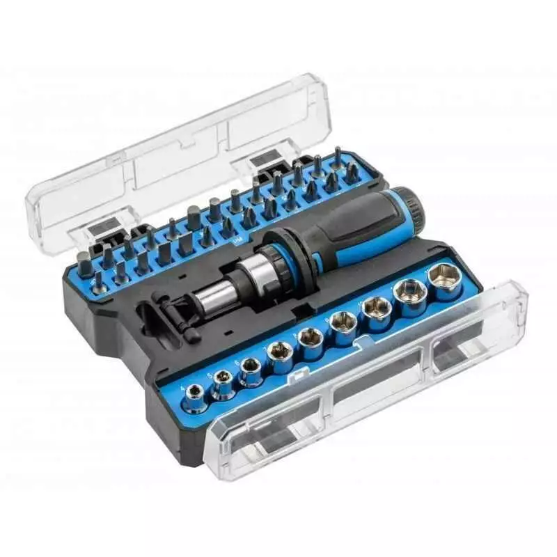 Этот набор отличается высокой многофункциональностью благодаря наличию 36 различных насадок, которые позволят вам работать с различными видами крепежных элементов.