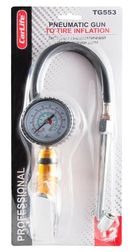 Пневмопистолет для подкачки шин CarLife,12Bar, шланг 450мм. мет.