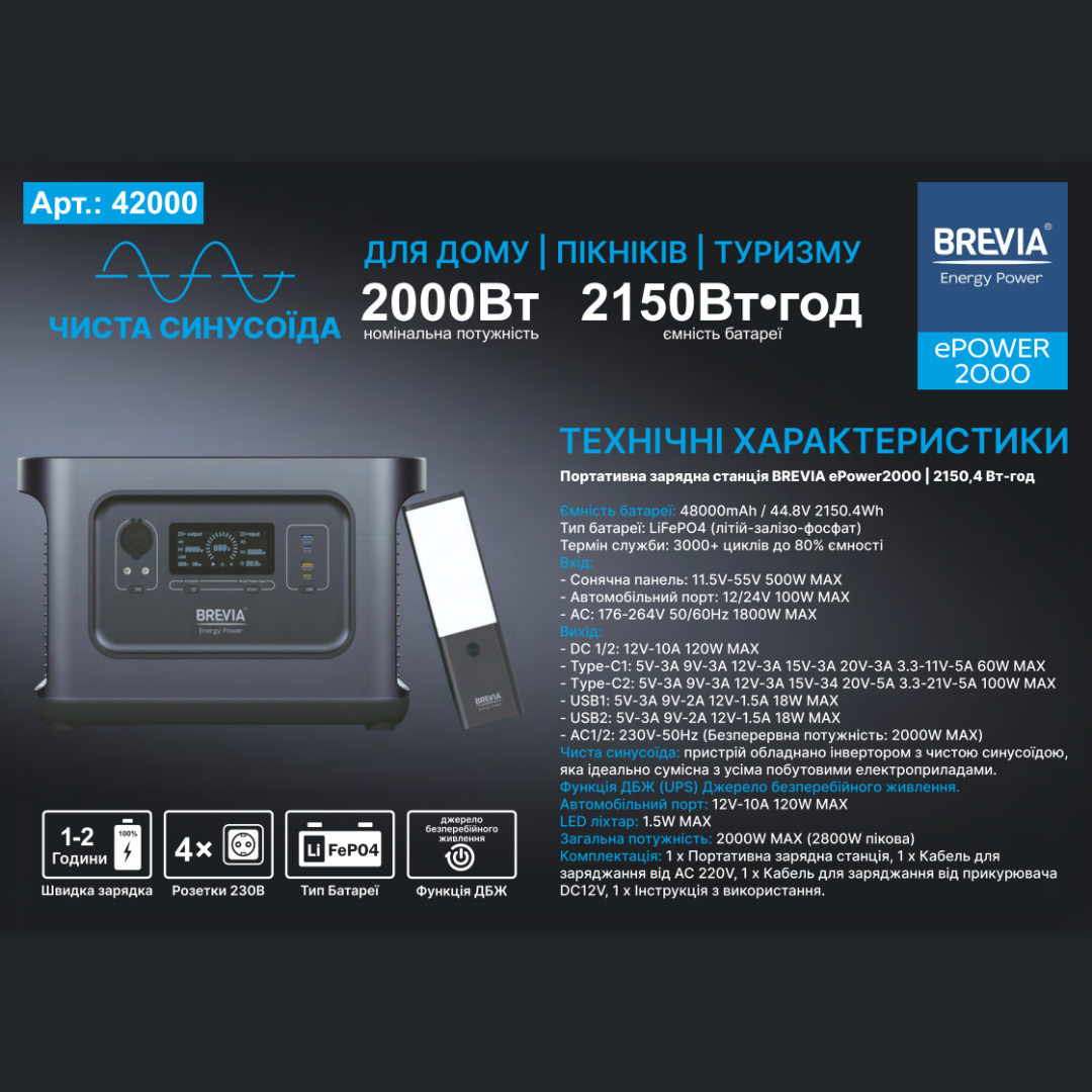 - Тип акумулятора: Літій-залізо-фосфатний (LifePO4)