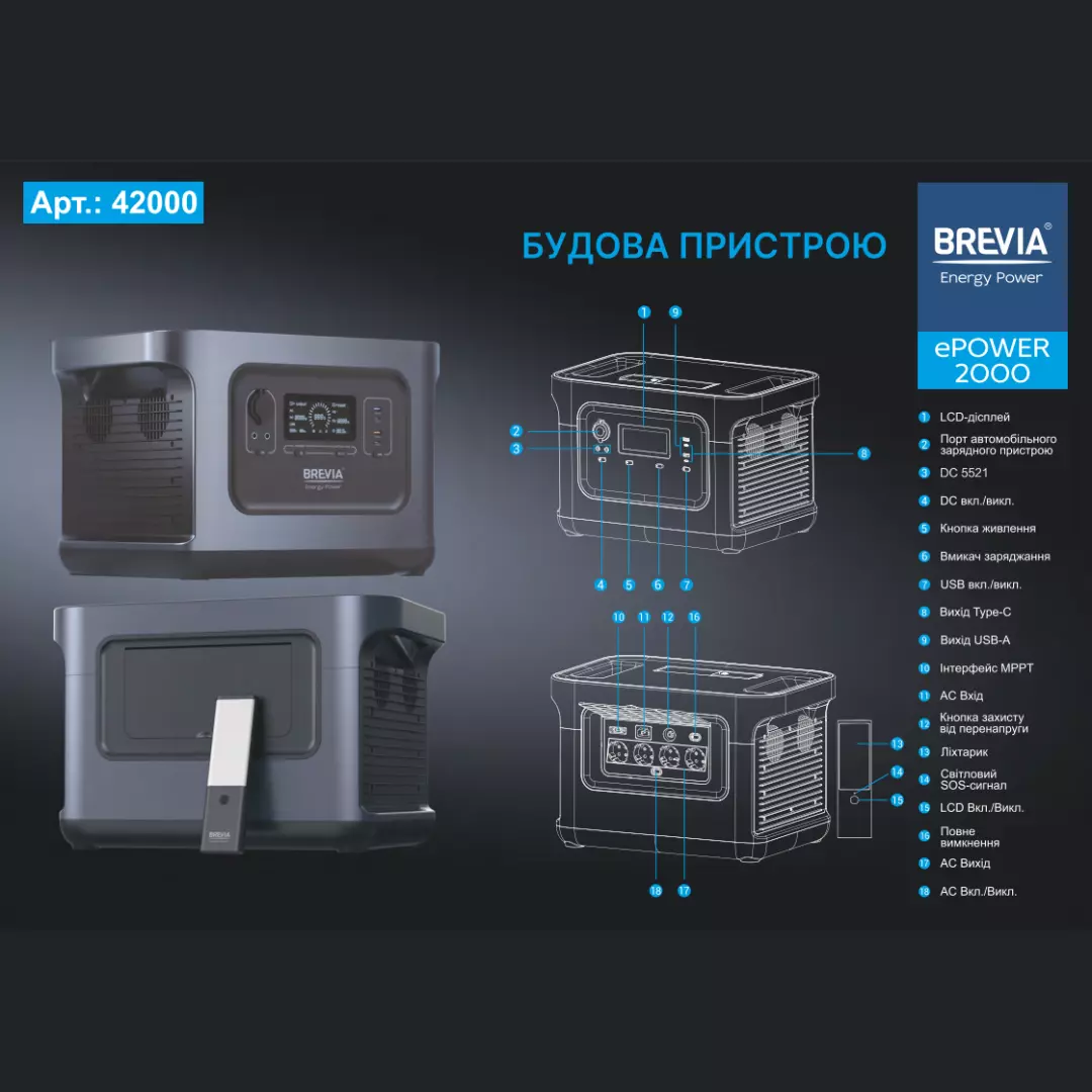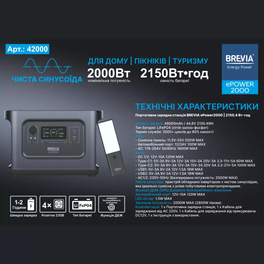 BREVIA eRower2000 – мощная и долговечная зарядная станция, которая позаботится об автономной работе вашей бытовой техники и обеспечит стабильную подпитку гаджетов, независимо от наличия розеток поблизости.