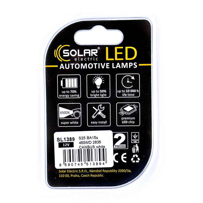 Работают лампы SOLAR S25 BA15s 12V 48SMD 2835 CANBUS white SL1389 (2 шт.) от напряжения 12 Вольт и универсально подходят для использования в любых легковых транспортных средствах. Благодаря невероятно белому свету с цветовой температурой 6500 К лампы обеспечивают великолепную видимость даже в яркий, солнечный день и повышают уровень безопасности во время движения по дорогам общего пользования.