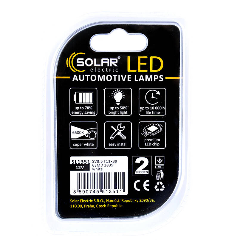 Лампочки SOLAR SV8.5 T11x39 12V 6SMD 2835 white SL1351 (2 шт.) работают от напряжения бортовой сети 12 Вольт и универсально подходит для легковых автомобилей, микроавтобусов, внедорожников, а также мотоциклов. Корпус лампы выполнен из высококачественных материалов, благодаря чему отличается великолепной устойчивостью к вибрациям или ударам, а также обладает великолепной теплопроводностью и обеспечивает эффективное охлаждение диодов.