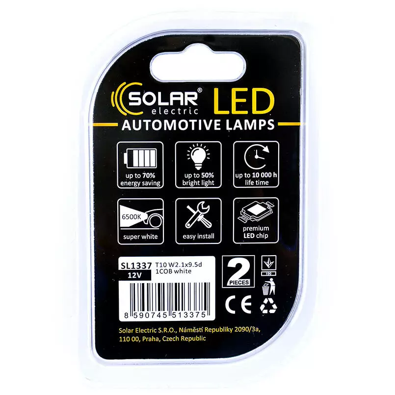 Светодиодные LED автолампы SOLAR Premium Line 12V T10 W2.1x9.5d 1COB white блистер 2шт (SL1337)