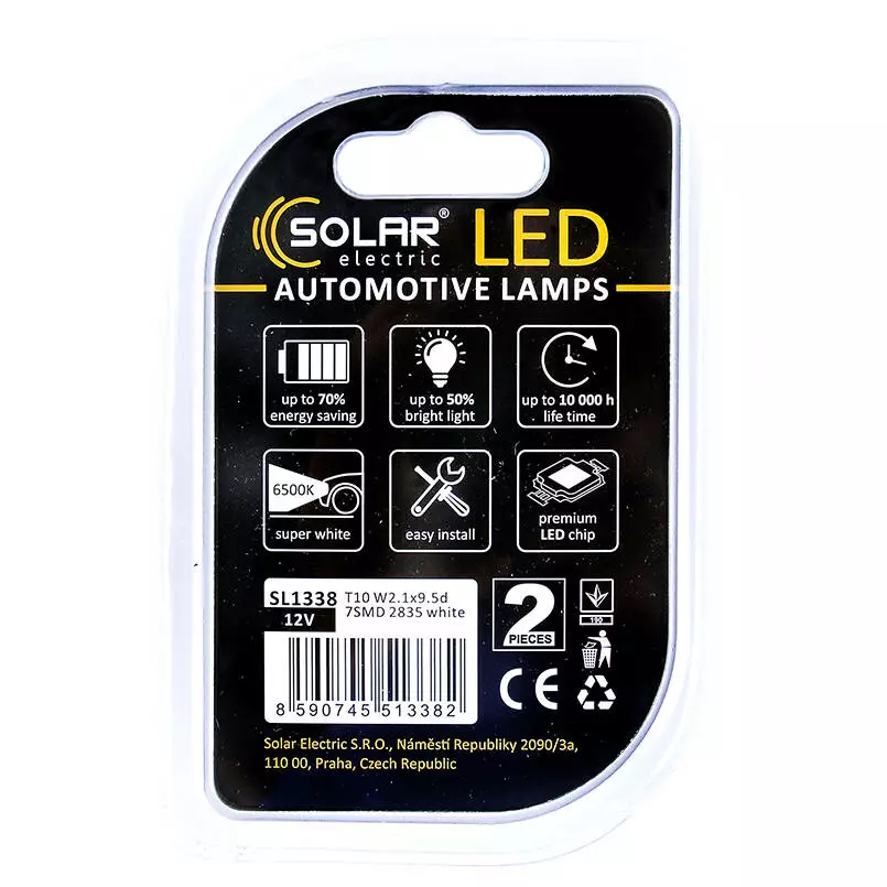 Лампочки SOLAR T10 W2.1x9.5d 12V 7SMD 2835 white SL1338 (2 шт.) работают от напряжения бортовой сети 12 Вольт и универсально подходит для легковых автомобилей, микроавтобусов, внедорожников, а также мотоциклов. Корпус лампы выполнен из высококачественных материалов, благодаря чему отличается великолепной устойчивостью к вибрациям или ударам, а также обладает великолепной теплопроводностью и обеспечивает эффективное охлаждение диодов.