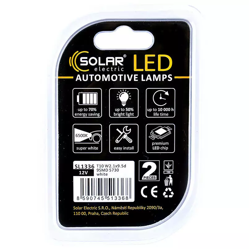 Лампочки SOLAR T10 W2.1x9.5d 12V 9SMD 5730 white SL1336 (2 шт.) работают от напряжения бортовой сети 12 Вольт и универсально подходит для легковых автомобилей, микроавтобусов, внедорожников, а также мотоциклов. Корпус лампы выполнен из высококачественных материалов, благодаря чему отличается великолепной устойчивостью к вибрациям или ударам, а также обладает великолепной теплопроводностью и обеспечивает эффективное охлаждение диодов.