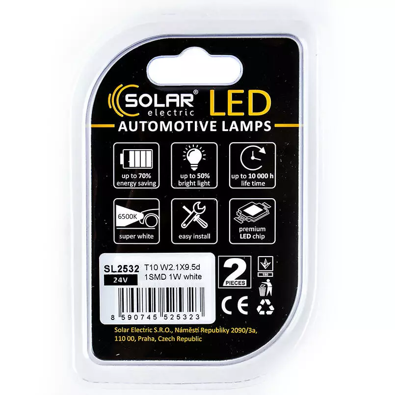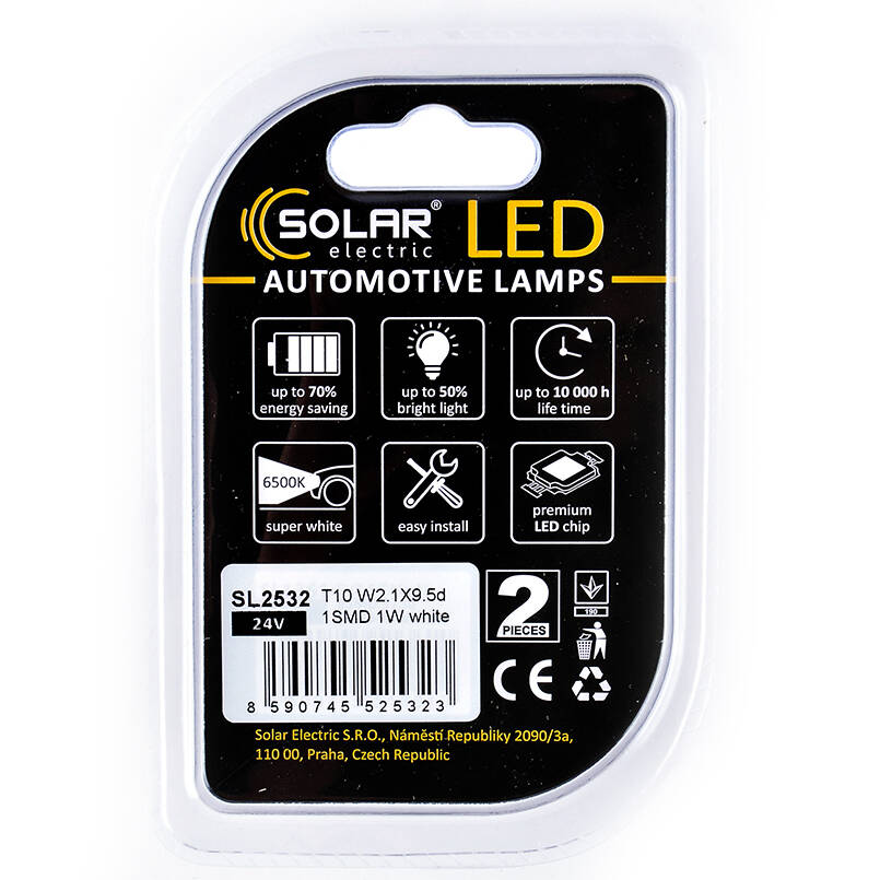 Светодиодные LED автолампы SOLAR Premium Line 24V T10 W2.1x9.5d 1SMD 1W white блистер 2шт (SL2532)