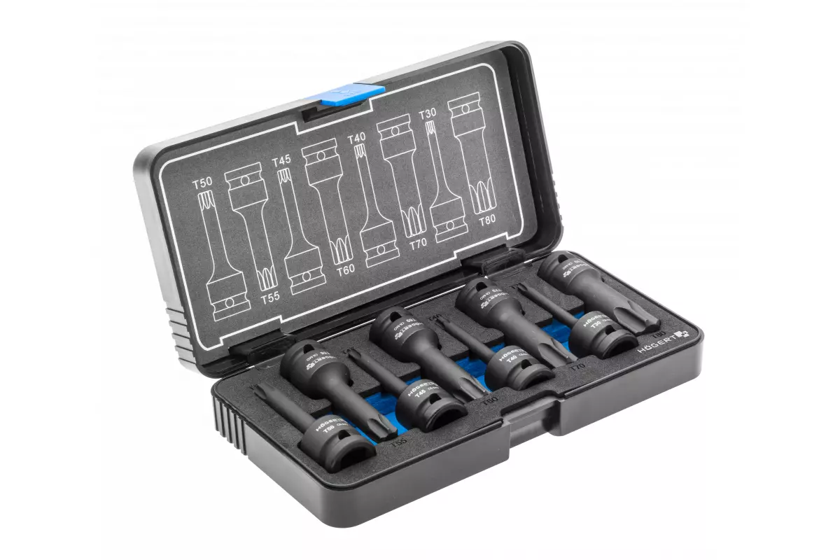 Торцевые головки, ударные TORX, 8 шт.: T30, T40, T45, T50, T55, T60, T70, T80, 1/2", CrMo (HT6R002)