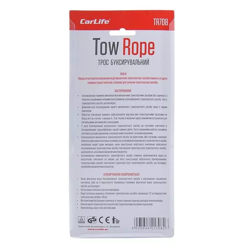 Трос буксировочный 3 т 4 м в блистере CARLIFE (TR708)