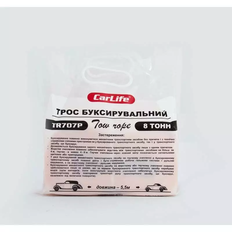 Трос буксировочный CARLIFE TR707P 8 т 5,5 м в пакете