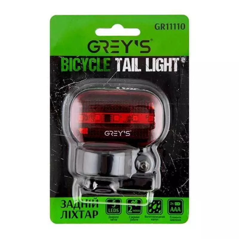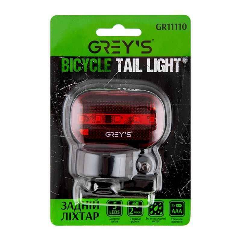Задний фонарь на велосипед 5 светодиода Grey's 2хААА влагостойкий 2 режима до 120 часов работы (GR11110)